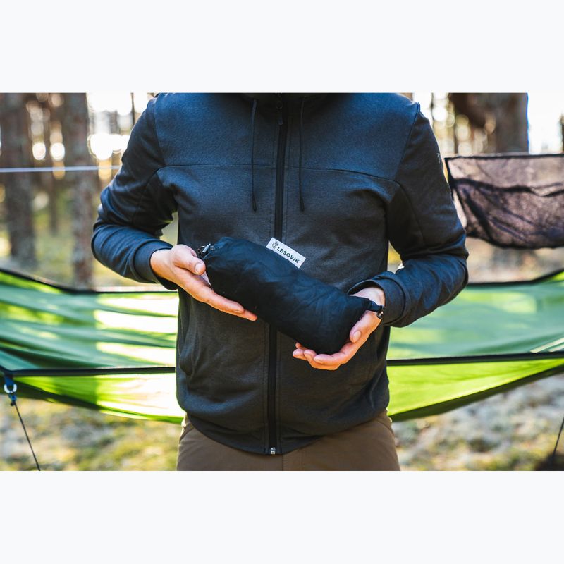 Turistický hamak Lesovik Draka treetop green je vybavený praktickými doplnkami, ako sú karabíny, laná na zavesenie a moskytiéra, ktoré uľahčujú jeho montáž a poskytujú dodatočnú ochranu pred hmyzom. Organizér a obal umožňujú jednoduché skladovanie a transport, a dodatočný obal mufka zvyšuje komfort používania v chladnejších dňoch. Jeho kompaktné prepravné rozmery 28 x 12 x 12 cm zaisťujú, že je ľahko zbaliteľný a prenosný.
