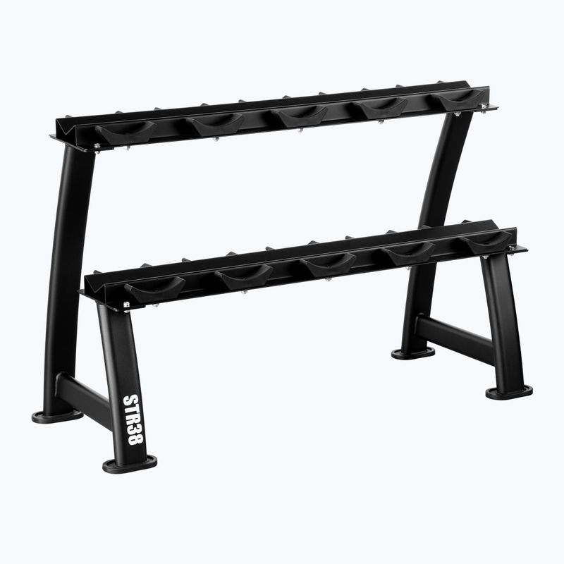 HMS STR38 – dvojúrovňový stojan na 10 činiek (5 párov), max. 300 kg. Stabilná oceľová konštrukcia, protišmykové nožičky, poličky naklonené pre pohodlie používania. Ideálny do posilňovne.